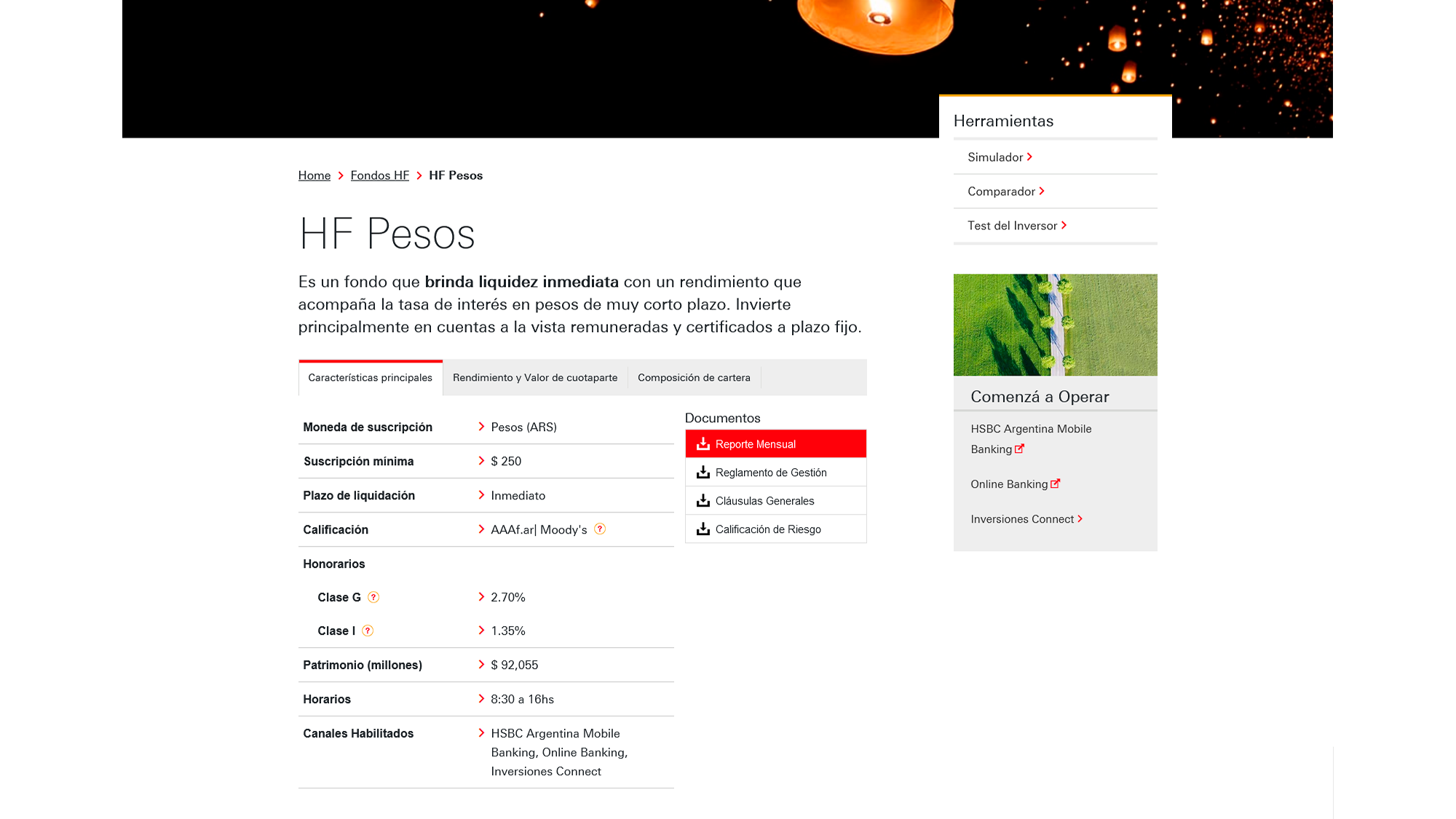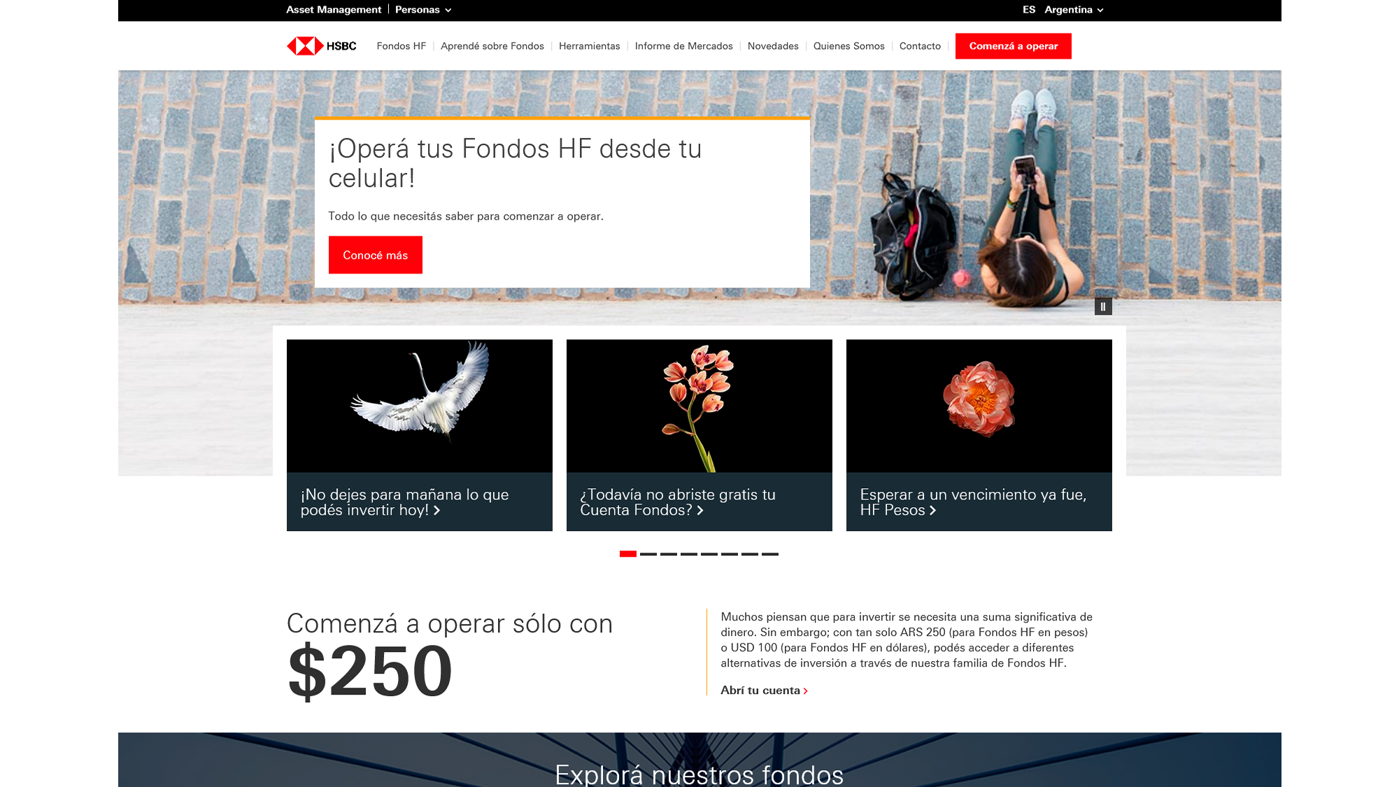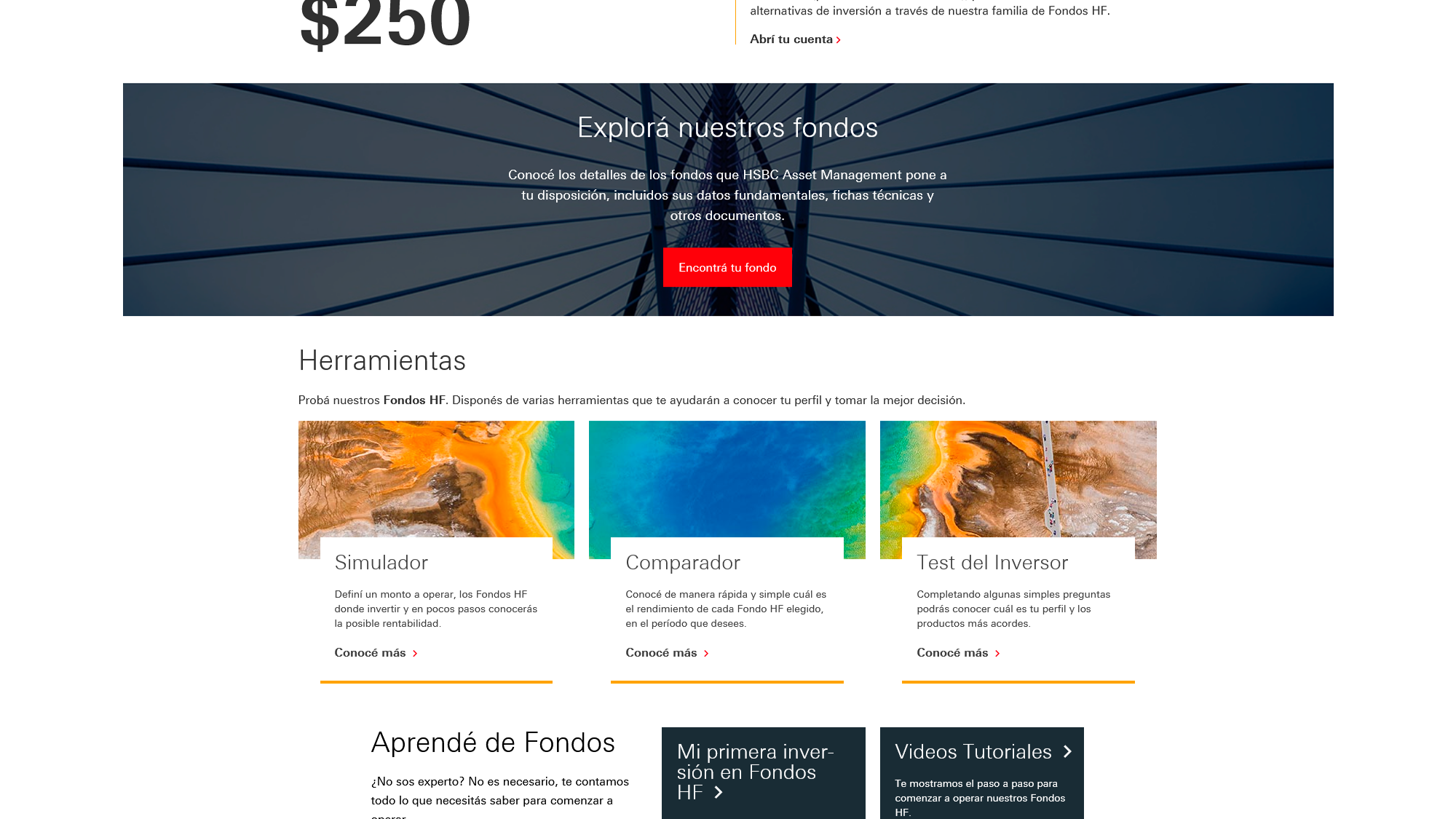 Renovación del subsitio de Fondos HSBC, no solo agiornando los estilos a los nuevos lineamientos globales, pero ordenando la información, generando nuevos espacios y herramientas pensadas para ayudar al usuario no solo en la toma de decisión para abrir una cuenta, sino a la hora de elegir cual es el fondo que mejor se adapta a sus objetivos. Generamos una sección con información para todos los usuarios: quienes invierten por primera vez, quienes buscan información regulatoria al respecto, novedades e informes, y detalles específico de cada fondo (valores diarios de cuotapartes, honorarios, rendimientos y composición, así como la calificación, tiempos y canales para operarlo). También mejoramos las herramientas de simulación y comparación de los fondos y generamos un espacio para simular el Test del Inversor y conocer más sobre los diferentes perfiles, necesarios para poder operar con el producto. También espacios donde el usuario puede conocer todos los canales que tiene para operar y realizar consultas.