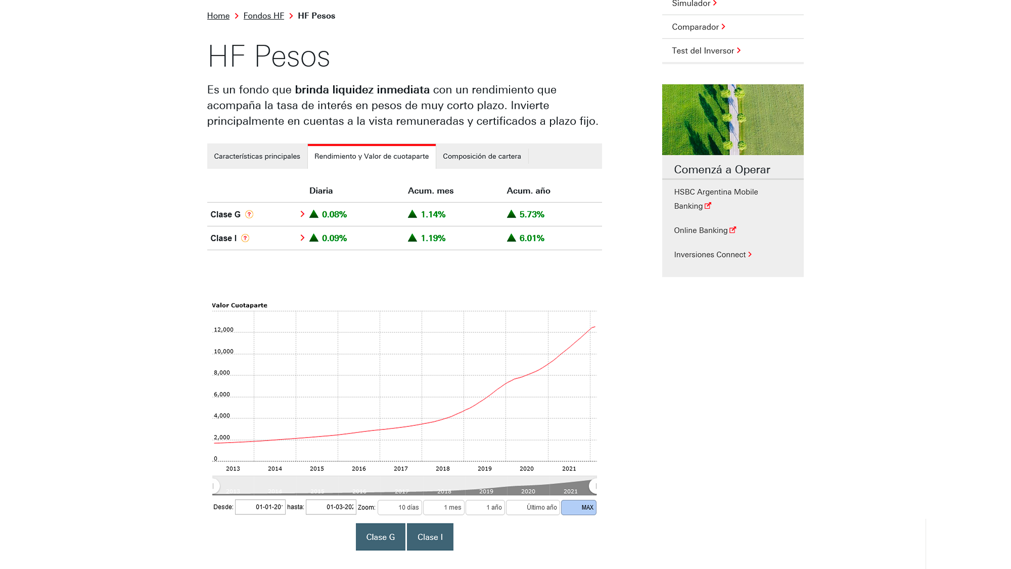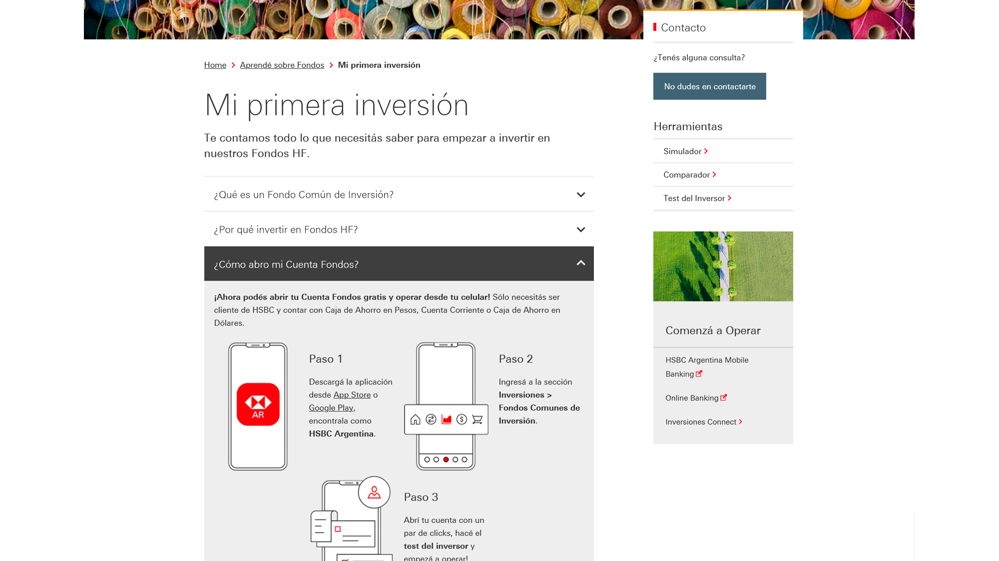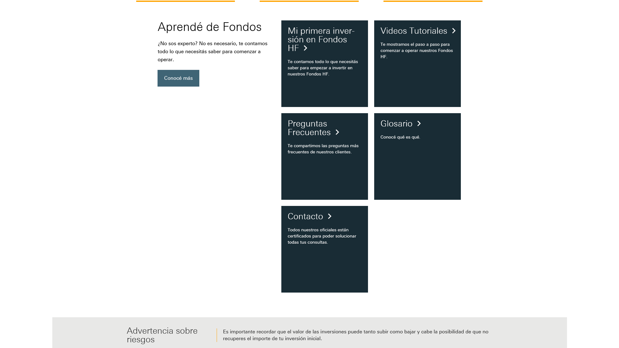 Renovación del subsitio de Fondos HSBC, no solo agiornando los estilos a los nuevos lineamientos globales, pero ordenando la información, generando nuevos espacios y herramientas pensadas para ayudar al usuario no solo en la toma de decisión para abrir una cuenta, sino a la hora de elegir cual es el fondo que mejor se adapta a sus objetivos. Generamos una sección con información para todos los usuarios: quienes invierten por primera vez, quienes buscan información regulatoria al respecto, novedades e informes, y detalles específico de cada fondo (valores diarios de cuotapartes, honorarios, rendimientos y composición, así como la calificación, tiempos y canales para operarlo). También mejoramos las herramientas de simulación y comparación de los fondos y generamos un espacio para simular el Test del Inversor y conocer más sobre los diferentes perfiles, necesarios para poder operar con el producto. También espacios donde el usuario puede conocer todos los canales que tiene para operar y realizar consultas.