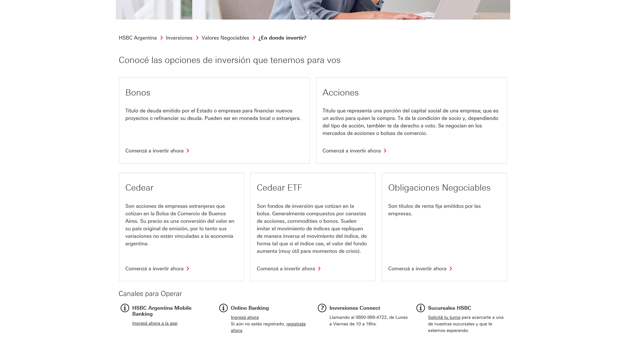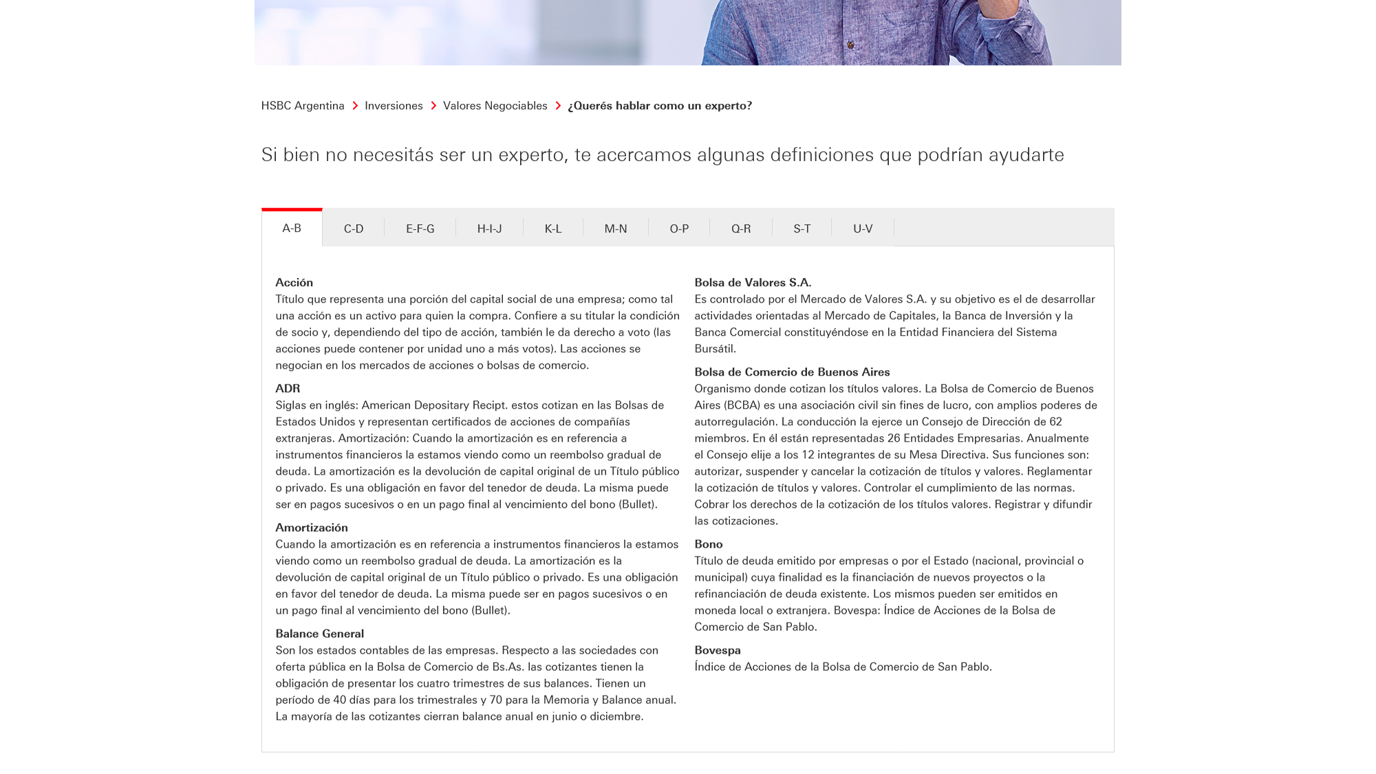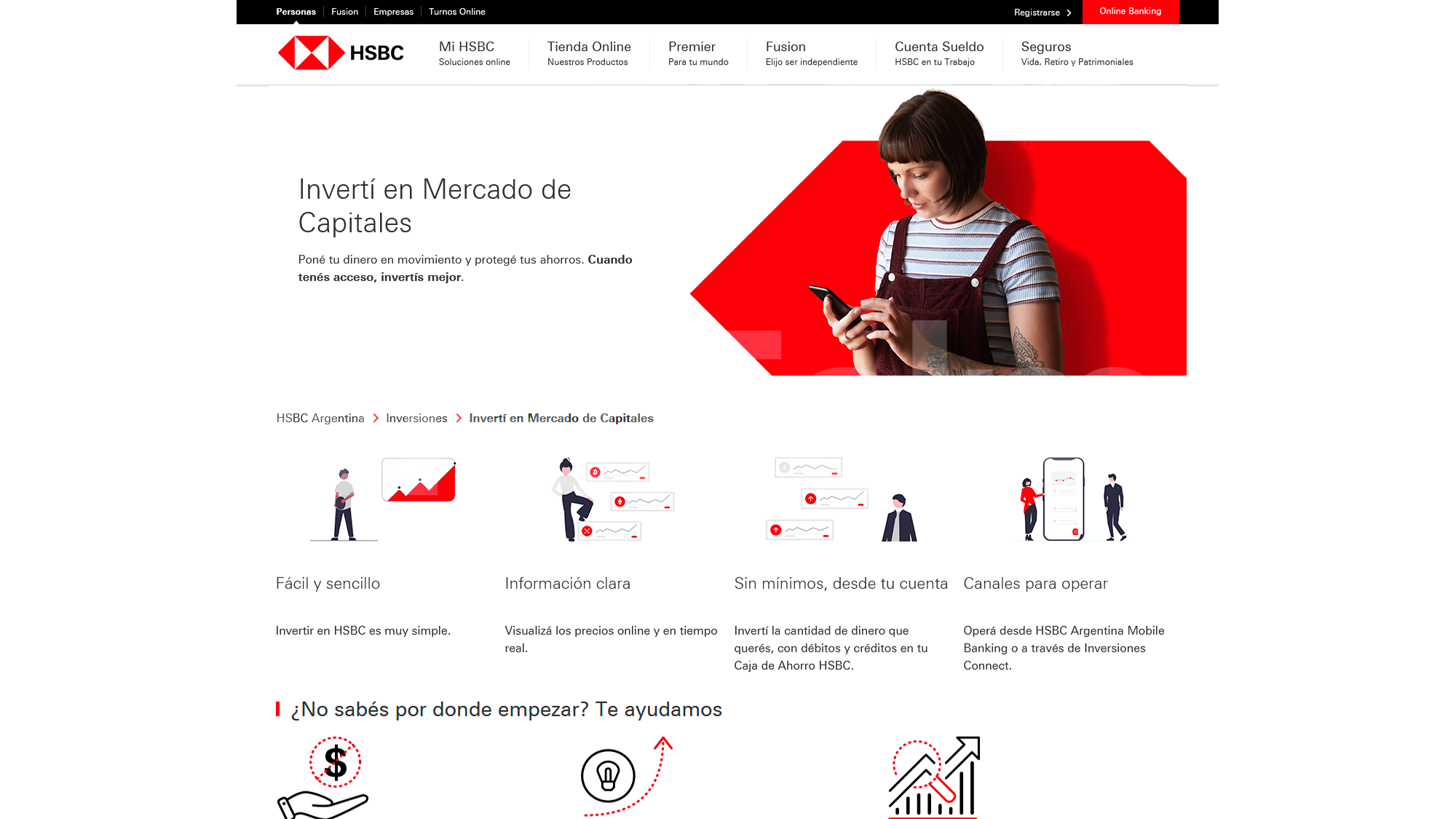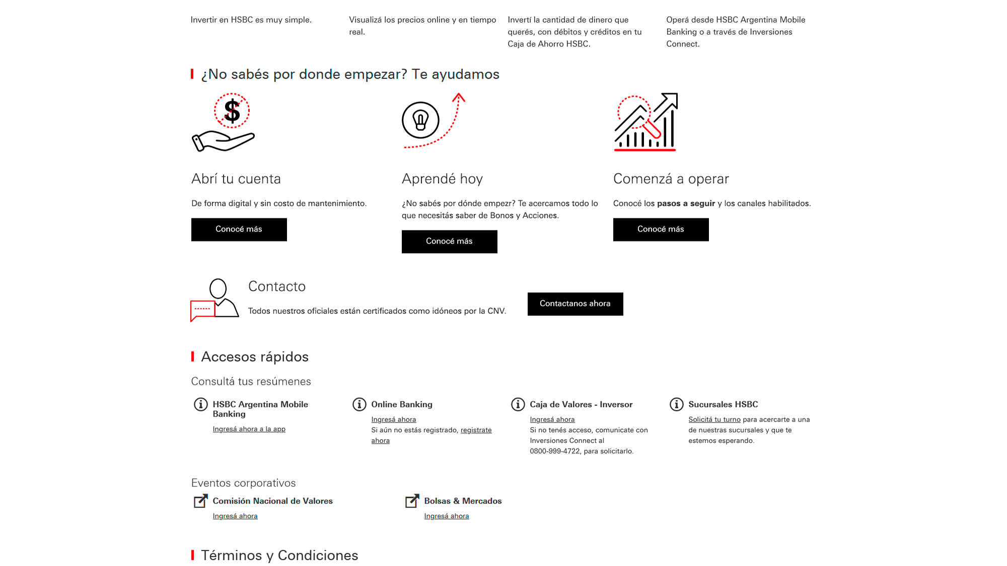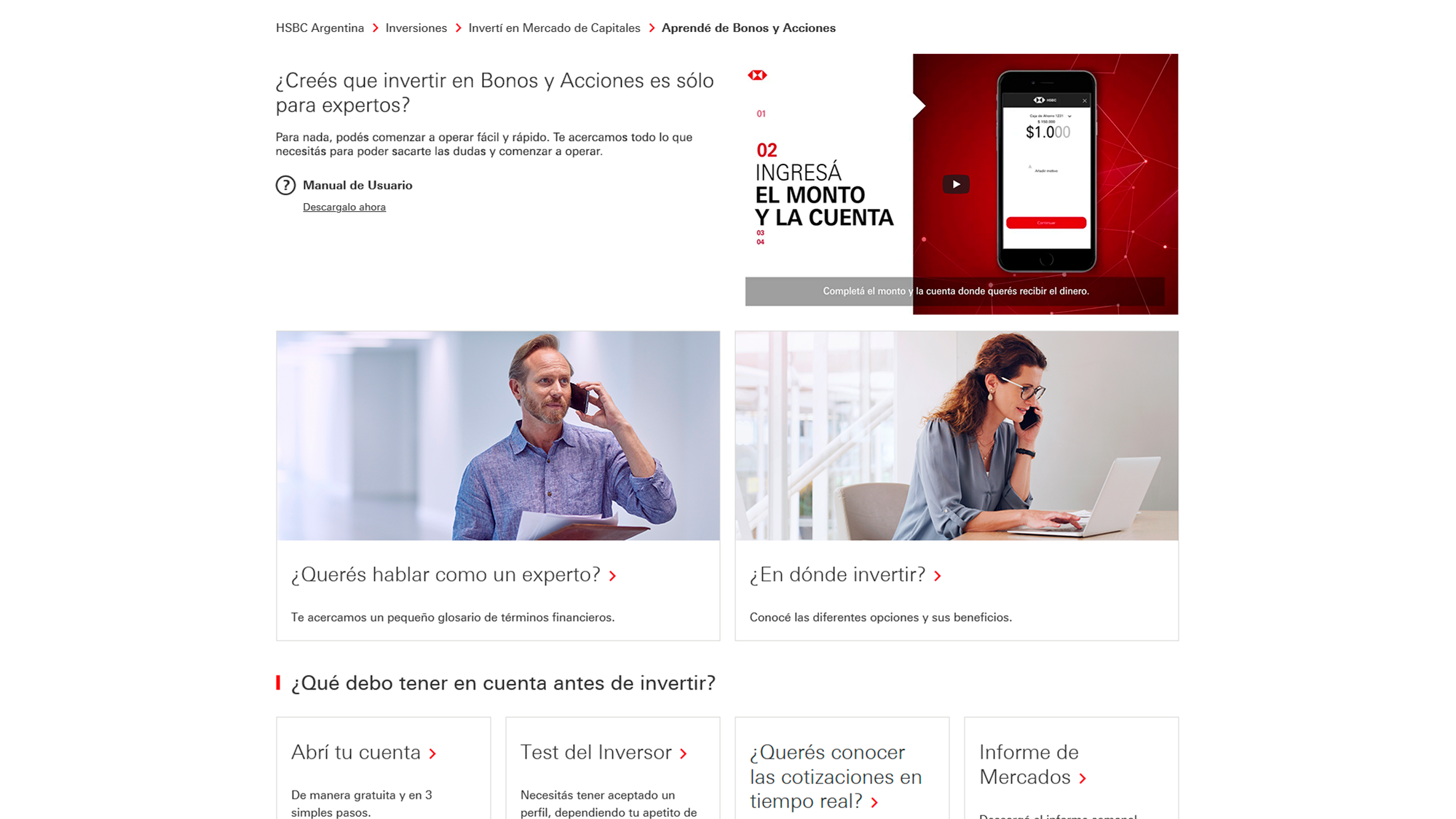 Renovación de la página de Bonos y Acciones para incluir más información a todos los usuarios (no solamente incluir la información regulatoria y que sólo le era útil al usuario entendido en el tema). Para ello generamos una página inicial que introduzca y ordene al usuario en que tipo de información busca: abrir una cuenta, obtener información para poder invertir, comenzar a operar y los canales de contacto en caso de necesitarlo. En cada una de esas opciones, el usuario encontraría, también de manera ordenada, la información necesaria al respecto, incluyendo herramientas que le permitan conocer más acerca del producto.